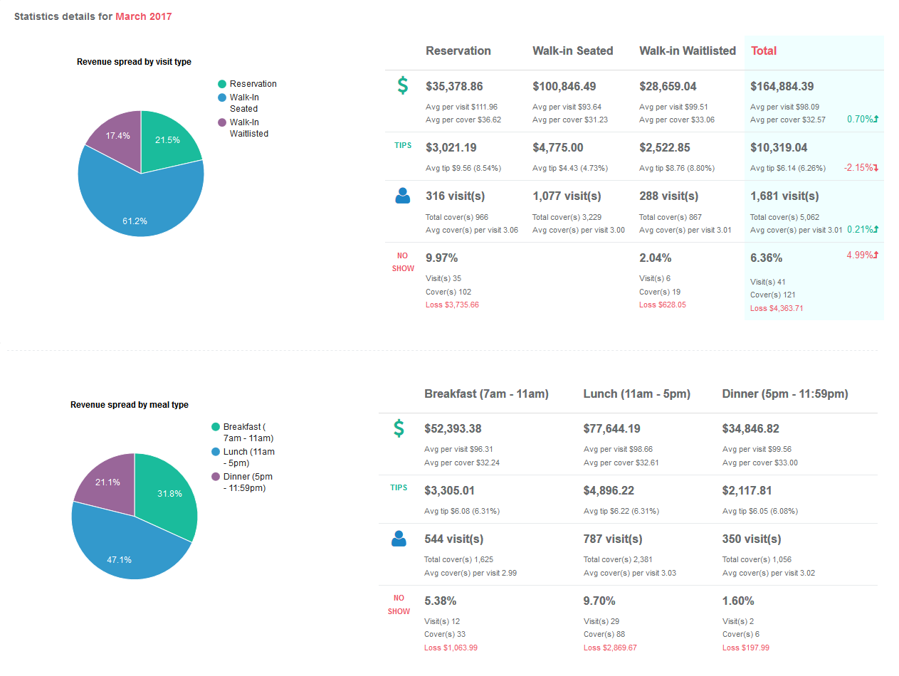 - No show visits - percentage of no show events in relation to visit type, total number of no-show events, total sum of covers, total estimated loss because of no-show event. Please note that for the Walk-in Seated event type, no-show information is not applicable, and thus for this column this field is always empty.