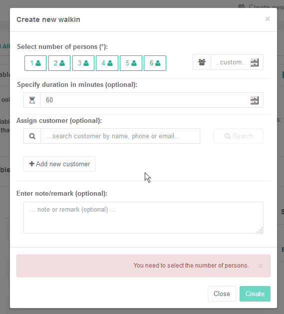 On the Walk in tab, mark free table(s) on which you want to seat the customer, and click the button "Seat customer". A Create new walk-in dialog will open in which you will have to enter details about the walk-in visit (number of persons, duration, customer information, note):